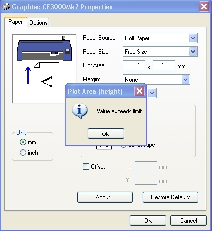 i have a big ( long) job come in and i need to cut 3.5 metres long x 360 high and i can only get 1500mm x 610 in the printer prefs. ! argghhhhhhhI’m using the graphtec as a windows printer as graphtec recommend, corel 12 and graphtecs ce3000 cut controller