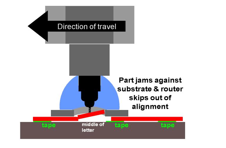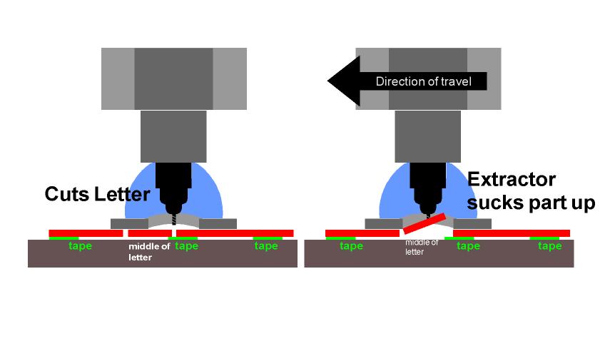 The extraction keeps sucking up the centre of a letter (this happens a lot with small letters where the centre of the letter has been missed by the tape)- this "lump" of material then catches on another letter or something else, and the router skips, then carries on.The attached (quick) drawings sort of explains it better!