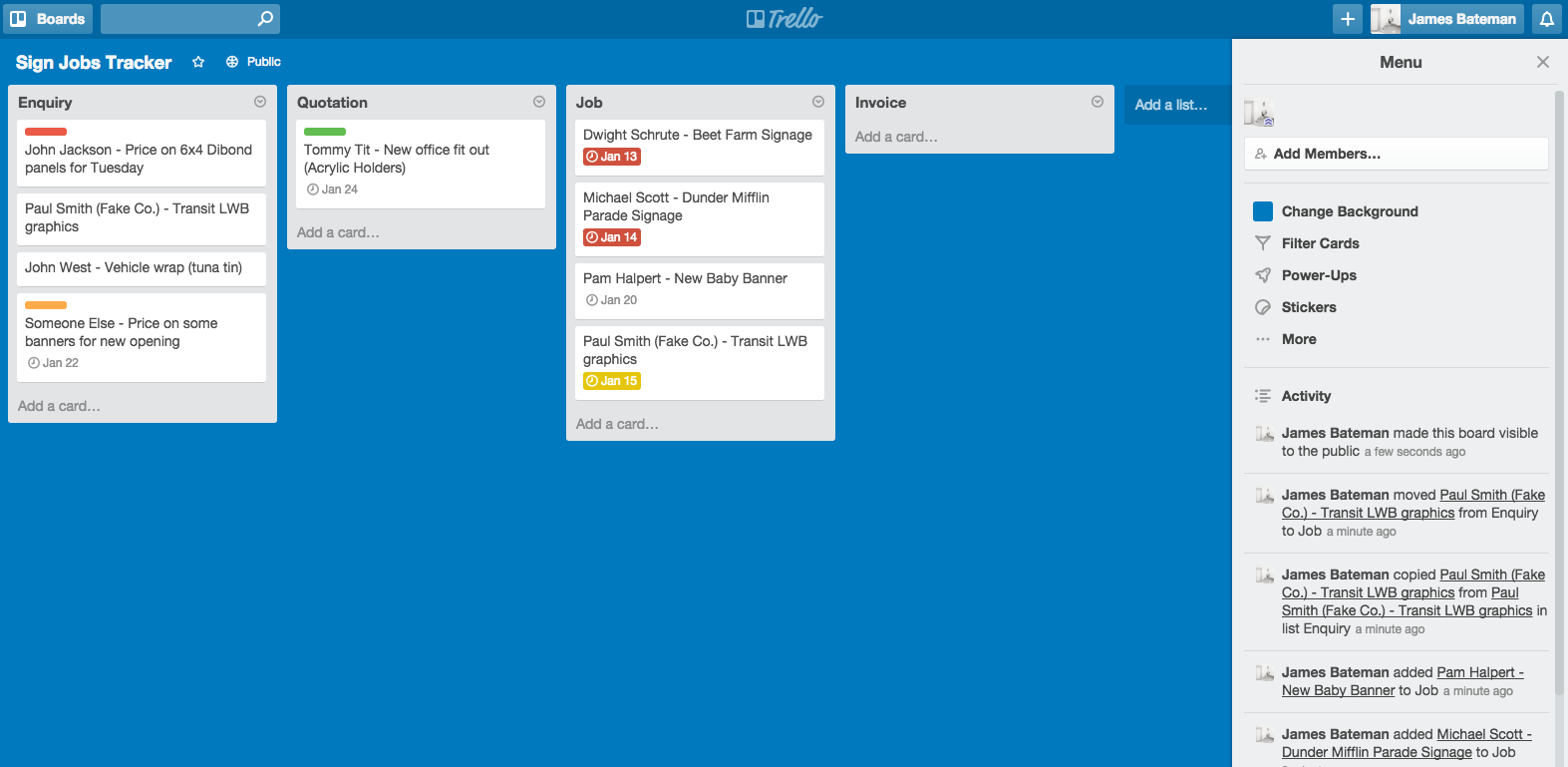 I’ve made the board public so you can take a gander: https://trello.com/b/XNHDmWGv/sign-jobs-tracker