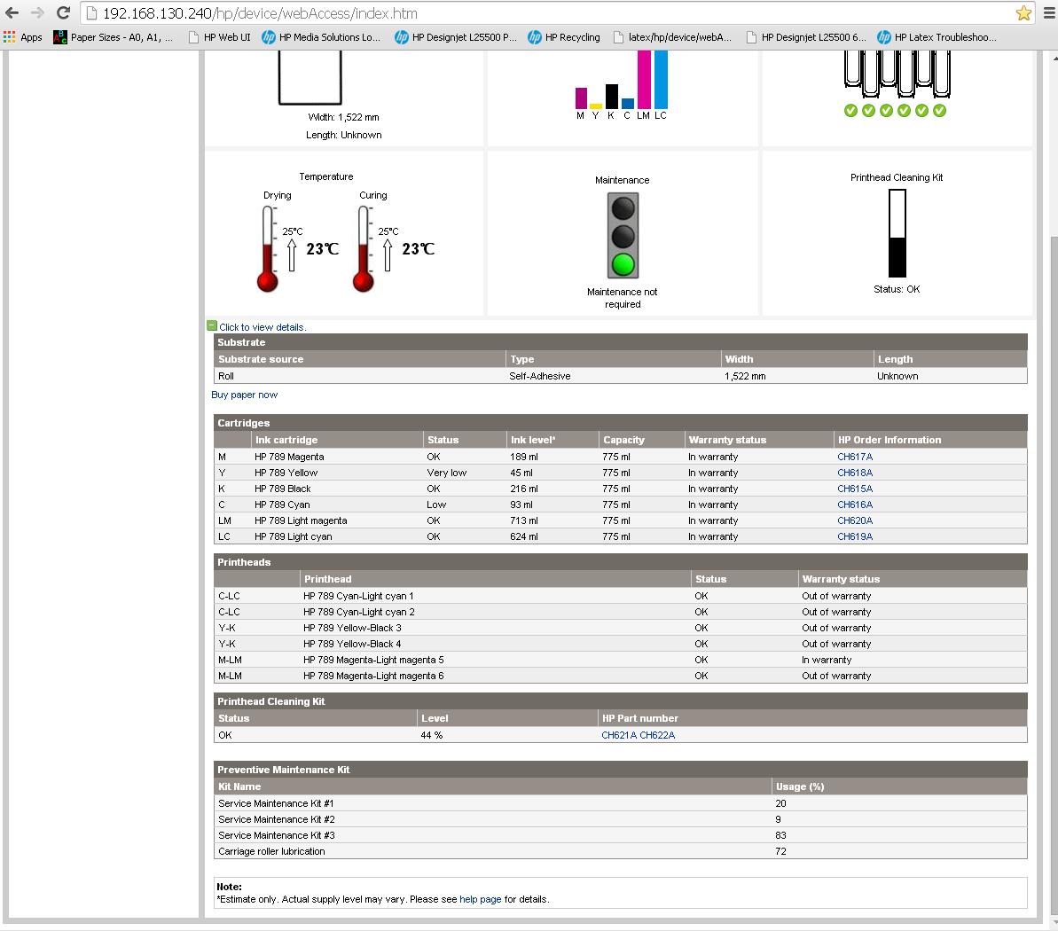 The print heads are all working fine (see the maintenance screenshot), I would say 98-99% clear and fairly new print heads installed, one of the interesting things about the Latex is it prints with multiple passes and if a nozzle is not working, you cannot see it affecting the prints, some other printers cause horizontal lining patterns as a nozzle fails but on the latex, you will very rarely see this happen.