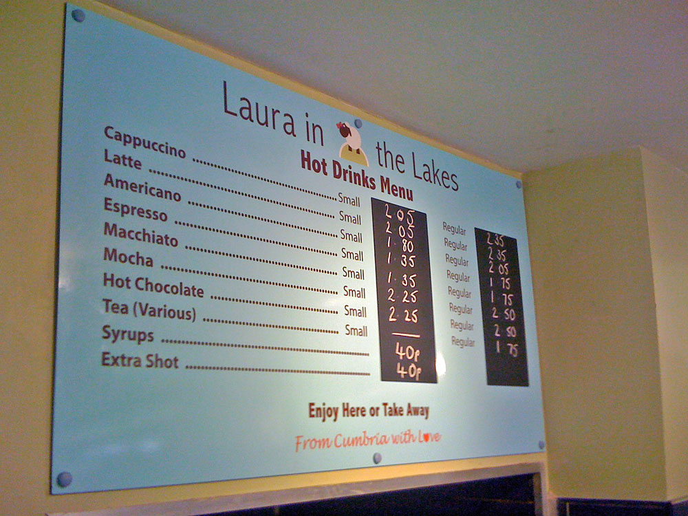 A local cafe I have done work for, (menu boards and price lists with chalkboard vinyl on composite boards: [example below]) now want something similar to go above their serving counter, Hung from the roof.