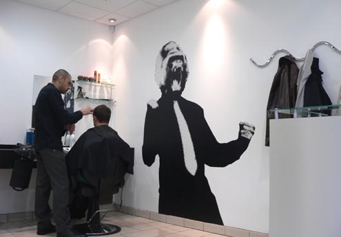 vinyl graphic installation for a barbershop chain – the graphic was a halftone pattern in matt black vinyl – standing about 2 metres tall the branding theme was based on the alpha male and in total i installed three at different sites – i was really chuffed with the end result as i only had a 24" cutter at the time and the join line was non existent due to the matt vinyl