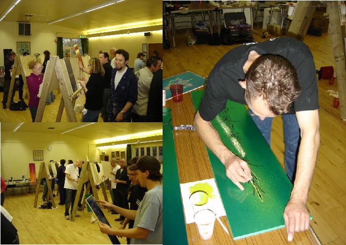 Here’s a few pics of Saturdays meeting, top left John Leeson (http://www.letterknight.co.uk) chatting up the female participants, bottom left overall view with Neil Melliard doing his best to look intelligent with a trainee, large photo of the top of Neils head, it was a really great day, thanks to Neil and Mandy, John & Pete for all the instructive comments and I hope it didn’t take you too long to get the paint off the floor :lol1: oh and thanks for all the sarnies, coffee and kitkats 😀
