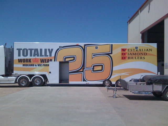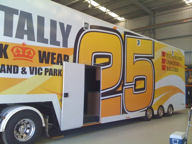 Nicola – Due to price constraints we used Ritrama Ri-Jet 50? film i think. It surprisingly went on really good although being calendered it didn’t stay down on the 2 rivets on the trailer. The trailer was the first thing I’d ever wrapped at the stage so it took near on a week @ 20 hr days to get it all done!