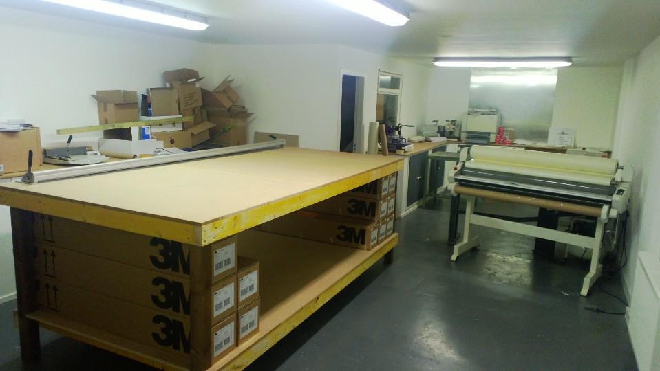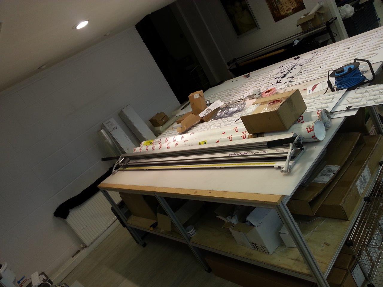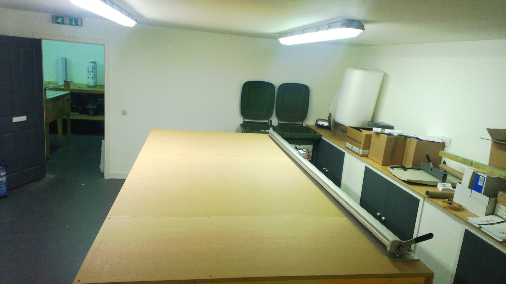 I’ve two brackets on the wall so hang the roll of the take up unit on them, and then pull the print across the bench to trim.
