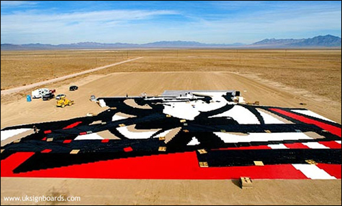 The logo consists of 65,000 one-foot by one-foot painted tile pieces that were assembled like a giant jigsaw puzzle: 6,000 red, 14,000 white, 12,000 eggshell, 5,000 beige and 28,000 black."