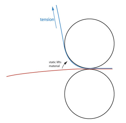 To ensure there are no air bubbles you usually need to apply tension to both base and laminate so that they dont touch before they enter the first set of rollers. This can be caused by them either falling together due to gravity or by static (caused by removing the laminate backing) pulling the two together.