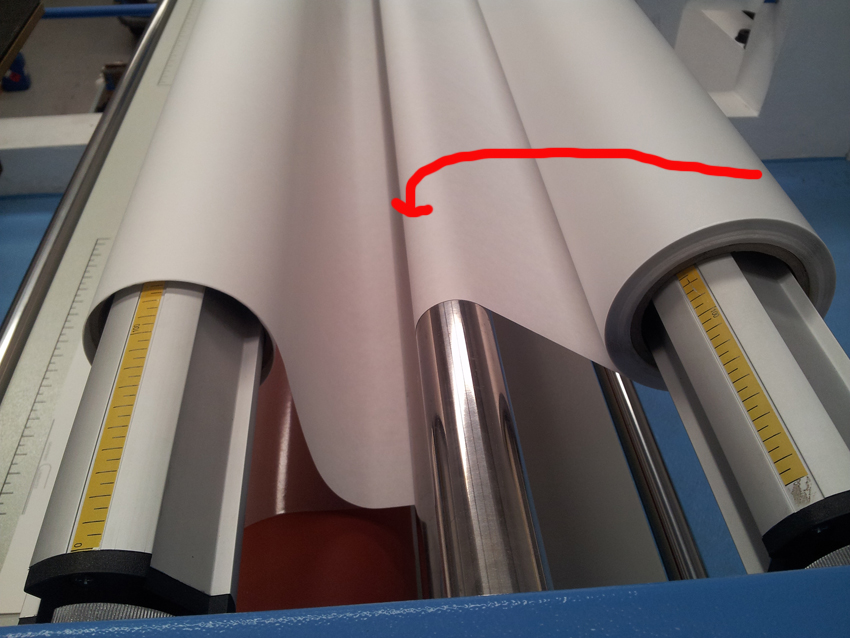quote Dan Osterbery:ok if we turn the roll over then the laminate is facing up and the backing paper is facing down, and it wont run through the machine! I have attached two photos so you can see what i mean!