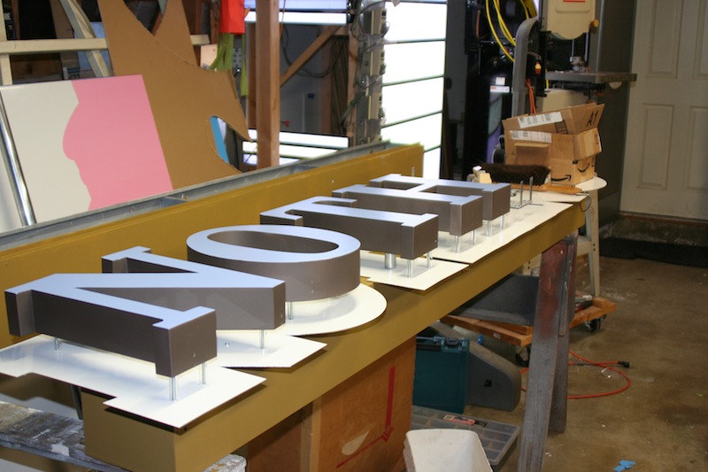 The other as you suggest is a flat cut Matt dibond letter either oversized as a feature or undersized mounted to wall to reflect the light off. Please do emailif you want further advice as this is a common problem area we deal with.