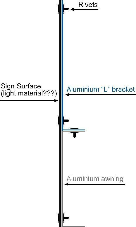 using two lengths of vhb tape of similar along the aluminium part stick a length of banner material to it and every 18inches put a white headed rivett and washer to secure. the banner wont have any weight in it and it can hang as oppossed to sticking up?also, the section that holds the canopy must be very secure to hold its weight. the top covering is normally in some sort of metal…galvanised steel?, as you can see in the picture. you could probably fasten a length of dibond onto that about 10 inches deep, rivetted along the bottom. "but" also a bit of bent alluminium flat bar screwed onto the wall where the lead flashing is stretching out to the sign and foxed with some rivetts again. the sign would hide the bad looking area above the canopy if nothing else.
