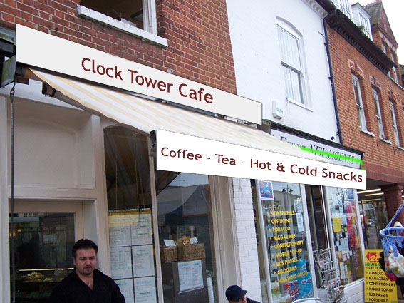 I am going to do a design for his window, there is a clock tower in the market square by his shop (hence the name of his shop is Clock Tower Cafe) I am going to use the pic to make an abstract design to fit his front window with his name and hope to persuade him away from the sign on the canopy.
