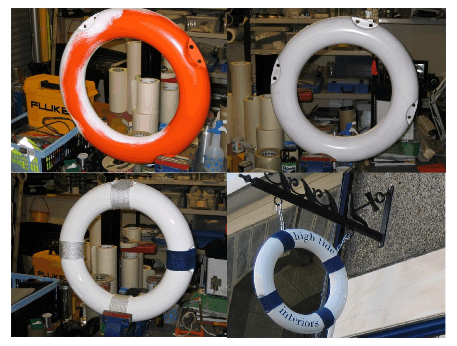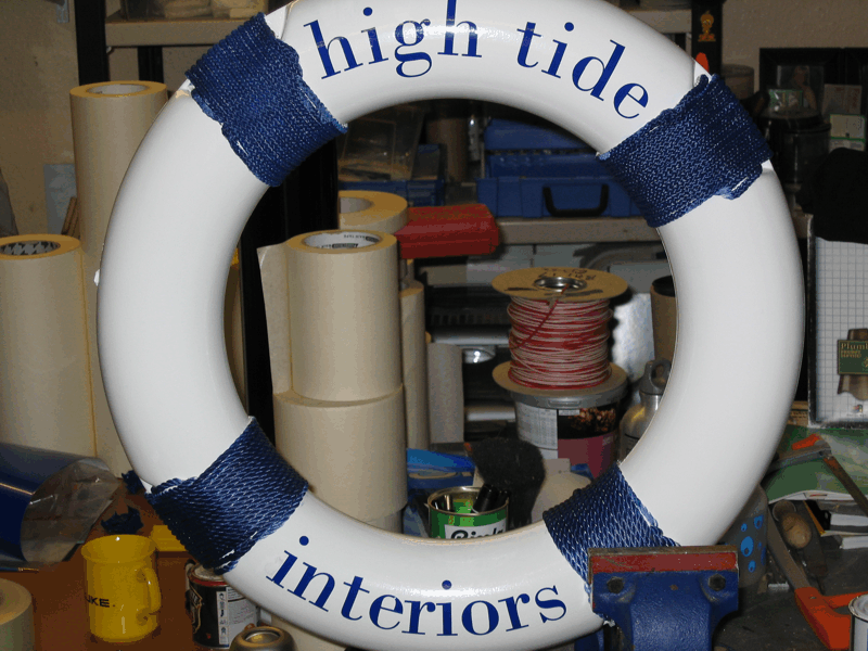 Mariner hanging bracket from Jag with a painted lifebouy with proper tied rope whipping and vinyl lettering