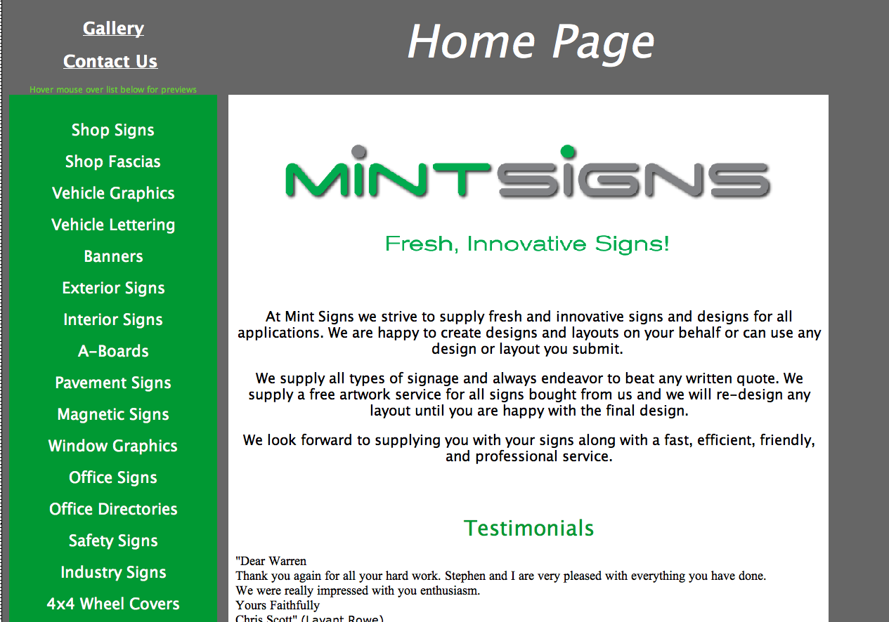 A slight variation on logo for Mint Signs using same font as Sign Sensations, I am also liking the dark red and dark gray colour scheme at the moment.