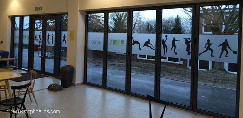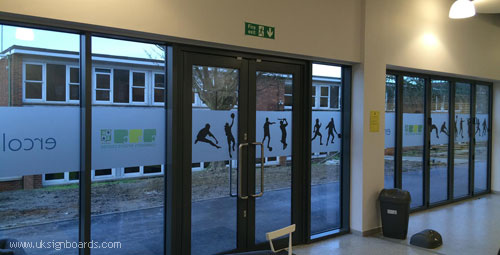 The school were able to provide a range of graphics, the majority of them silhouettes of various sporting activities, which were adapted for use by The Window Film Company’s in house graphics team. With a few minor adjustments made to the artwork, proofs and a sample panel were created and supplied to the school for approval. With the proofs approved, the print was carried out at The Window Film Company’s Chesham headquarters – the designs printed in colour onto a band of film sized specifically to meet the appropriate manifestation legislation. The film was then fitted by a team of The Window Film Company’s trained installers. The work took place at a pre-determined time and date, with the install carried out quickly and efficiently to ensure the minimum of disruption to what is a busy school.