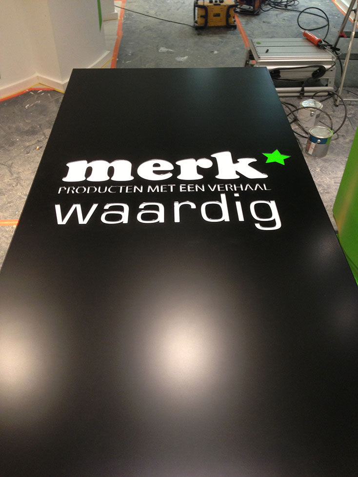 computer cut Dibond panel, painted black (delivered white instead of black) with backlight. White plexipanel with green translucent star.Applied also a black band on the bottom of every window. Used 3M series 50, applied wet
