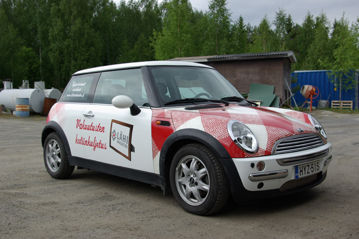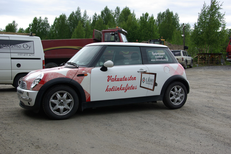 Posted by Otto Peltonen on 27 August 2010 at 07:58A very educating and interesting experience indeed, I know I could have started with an "easier" vehicle to wrap (such as my own van), but since I was offered to do this… the result was worse than wished for but better than feared; as most my jobs. Comments and criticism is most welcome, I´ll take it like a man… I think 😀 The layout is mine; square pattern, photo frame and fonts are company brand.