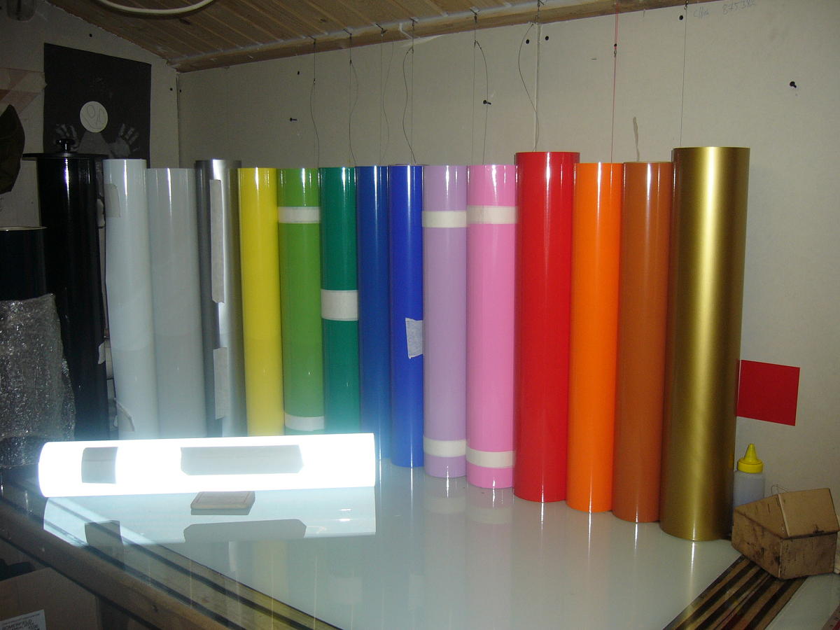 The roll of what looks like white vinyl on the table is actually the blue reflective.