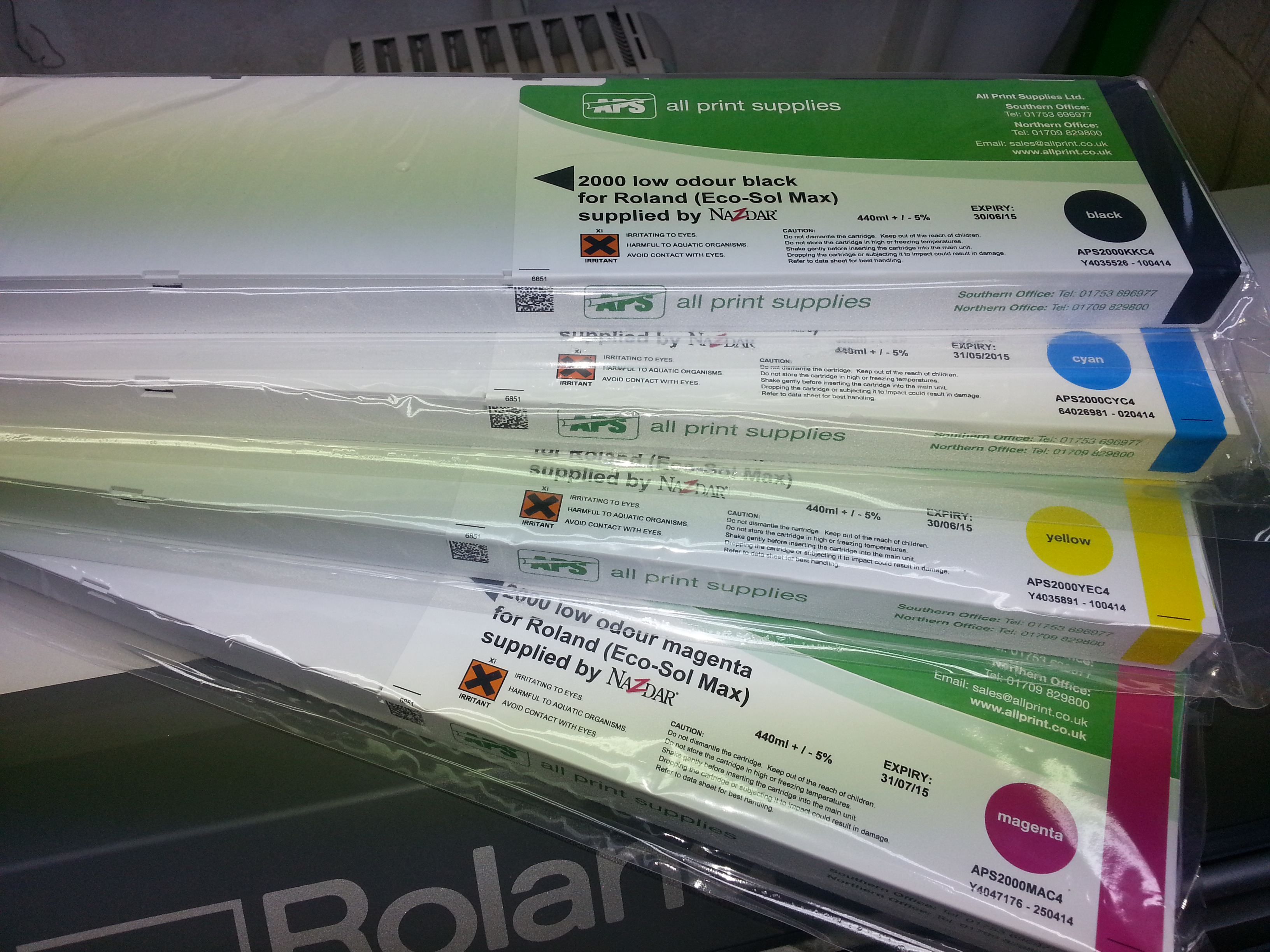 Having just had our Roland VP540 converted to use Colorific’s Lightbar and UV ink, we now have a full unopened set of APS/Nazdar ink cartridges that are surplus to requirements.