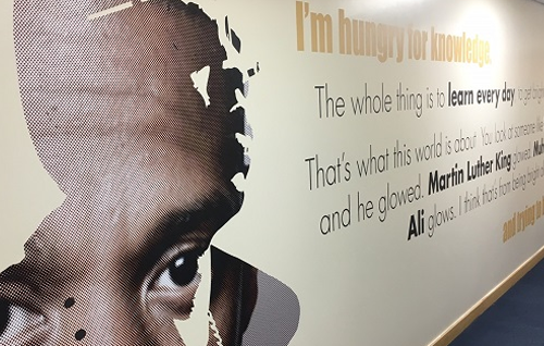 The college on Monks Road wanted to create a more exciting learning environment and designed a series of wayfinding signs, infographics, interactive notice boards and internal wall graphics featuring images and quotes from famous people.