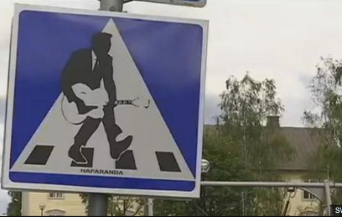 A town in northern Sweden is encouraging pedestrians to hop, skip and even play air guitar like Chuck Berry as they cross the road, with a series of new street signs.