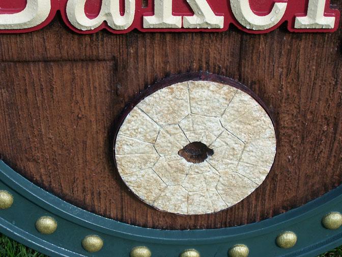this is all hdu with an inner core of eps foam, with a mdo .75 thick back on it for mounting.the close up shows jagged text, those bumps are just water drops. i had just sprayed it with the garden hose. in the close up pic, the grist mill was dremmeld to get the appearance of seperate stones. the band around the stone is a strip of roof flashing i cut. it is painted with paint i mixed sand into to get the rusty look i was after. the outer staves of the sign show a spot or two un-painted. it was touched up.