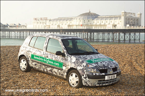 In fact, the idea was conceived jointly by Homelets’ Nigel Hughes, and Patrick Weams, who runs Mayday, a Brighton-based promotions agency. And it was Patrick, currently involved in sourcing a printer for a number of building wrap projects, who found the ideal company to wrap the Homelets’ Renault Clio just an hour away along the coast.