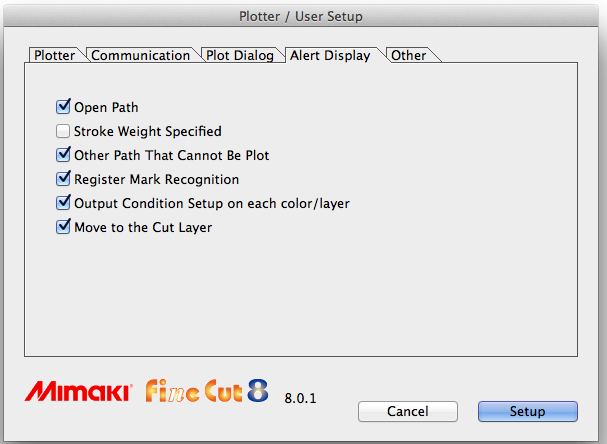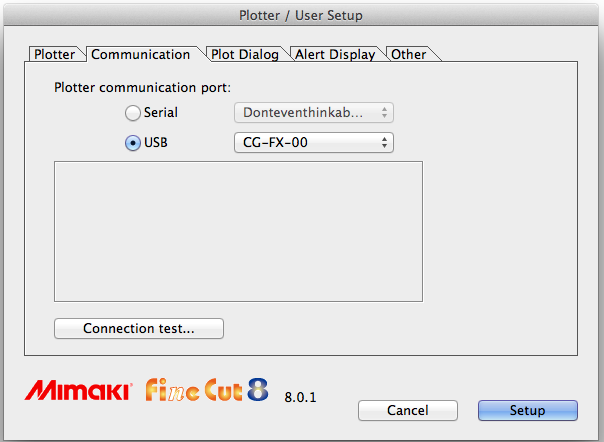 I am having problems plotting to my Mimaki CG-160 FX from my Mac. I am using Adobe Illustrator CS2 on a Power PC G5 Mac connected to the plotter using a USB 2.0 cable and I am trying to plot from Finecut 7.0. Everything looks fine but when I click Plot, then OK on the Plot Out dialogue box I get the message "Non-Mimaki plotter is connected. Finecut is able to output to Mimaki Plotter." I have tried everything I can think of, the only thing I did notice was in the manual it said if you were using a Mac you should use "optional USB-serial adaptor (with a model number of OPT-SS036O", this is the only thing which I have not tried. Has anyone else had this problem and managed to resolve it?