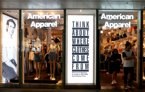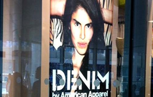 Lauren Harrold of PressOn said: “With the help of CMYUK we recommended a new lightbox LED system for American Apparel for their window graphics at the Kings Cross store. Previously their graphics were glued into an LED frame and an installation team was needed every time the graphics were changed. CMYUK recommended the Spirit-TEX system that enabled PressOn to print graphics on Samba textiles, stitch silicone to the edges of the fabric and then “pop” the graphics into place.”