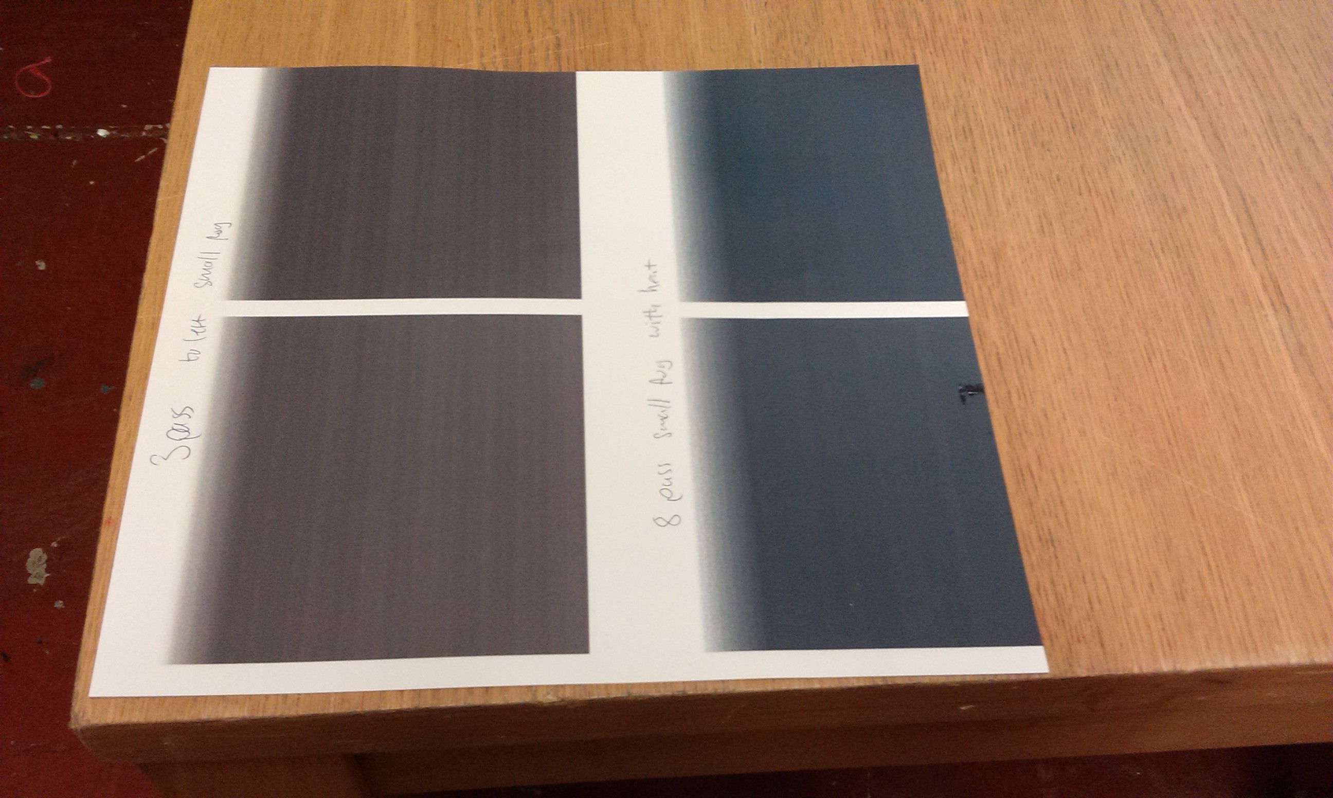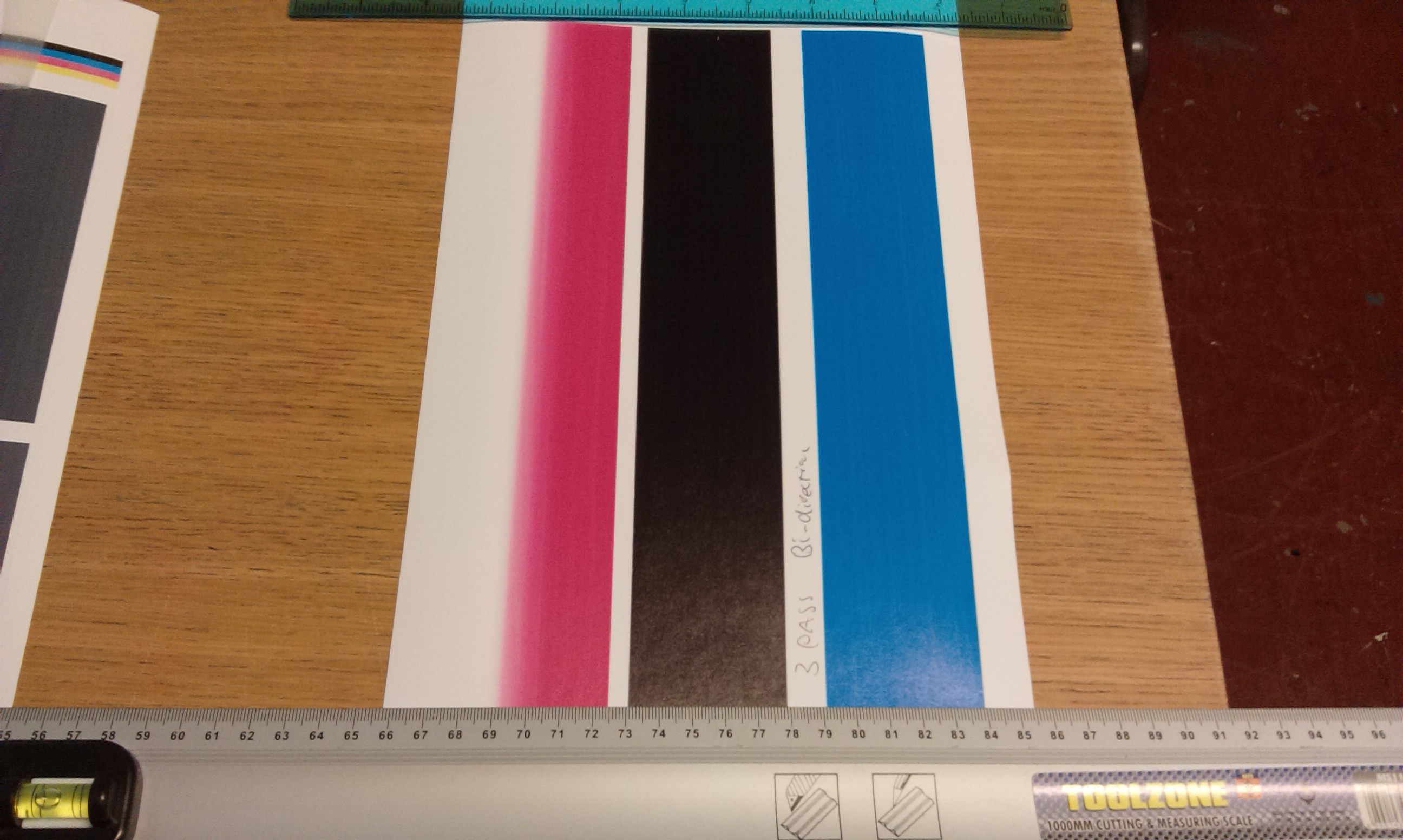 We recently bought a Galaxy Printek Eco-Solvent printer 1.6m. We have found the printing is ok on 3 pass / 4pass on vinyl, it is very good with 8 pass, however when printing onto poster printer the print isnt good, with very visable banding, and if printing on 3 pass it is terrible, especially with certain colour like grey and with solid blocks oof colour. There seems to be two types of banding, a consistent thin lines, up close they look like magenta, and then the other banding is very inconsistent, creating a dark streak, next to a patchy streak, have a look at the attached pics.