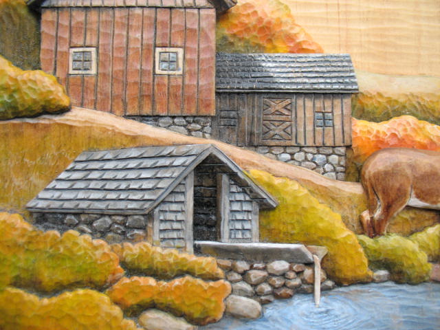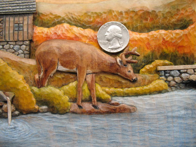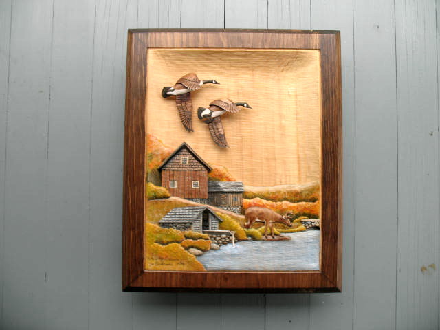Image is 11"x14"…..1" thick. Eastern White Pine, all hand carved…..no sanding. The colors are oil stains. The geese are carved separately and added on.