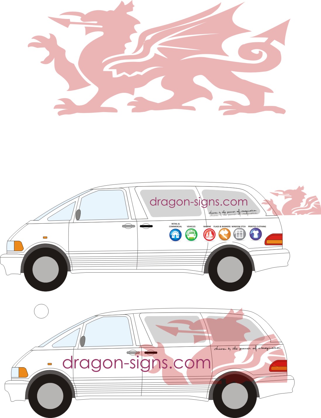 still not using a van so the Previa is the target, the plan was – some time ago- to wrap it black (reflective) and use an optically transluscent red film for the dragon, plan being that the dragon would light up as the black reflected white at night and, look iridescent during the day but, as the website is predominantly white, i reckon a rethink is in order, now considering the colour change to white with lam’d white contravision over the tinted rear windows and then applying whatever on top.