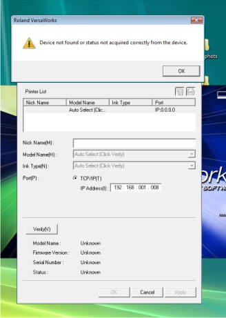 Hi All, I plumbed in a new modem router yesterday as the old one died and now cannot connect to my printer, all i get is the message shown below, i have done all the usual initialized application got the ip address off the printer but to no avail, can anyone shed some light on this please need to get some work done