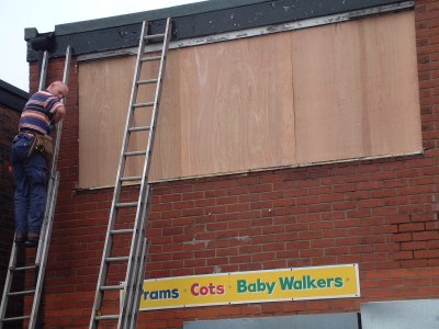 Up a ladder 😉 Just been busy with shop work and my evenings & weekends I’m out fitting all the time. I’m still doing alot of window graphics which is taking up alot of my time, but jobs like the toy shop have been eating into my time like a beaver chews through wood! 😕 It took almost 6 hours to do the white sign for the toy shop and that was just the fitting. We had to remove all the glass, all the outward opening windows, attach ply and batoning to the window frame, seal it all with masticy stuff then attach the sign. And I had to eat a McDonalds Happy Meal as there was nowhere else to get food 😥 The things I do for a sign job 😕