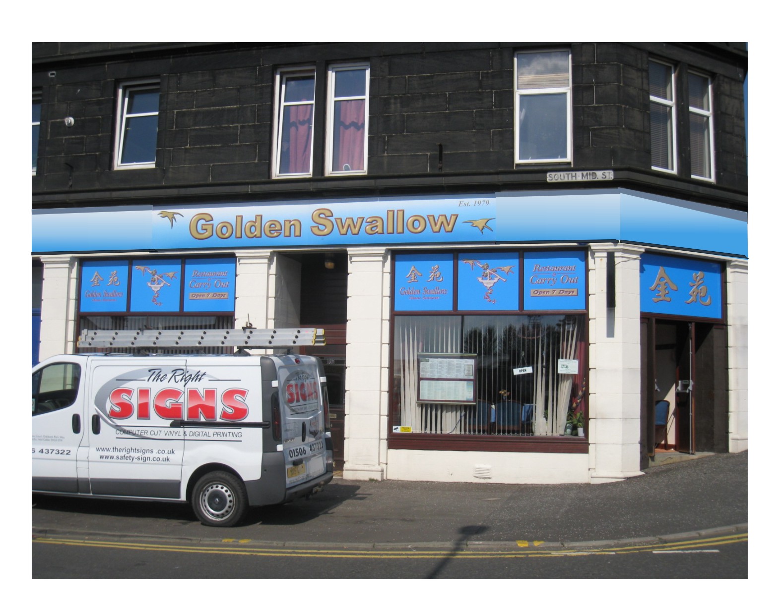It was the restaurant owners that chose the colour scheme. They wanted gold lettering on a blue background. Originaly I was going to print and cut the lettering and fit these to blue coloured boards. Then I decided to introduce the colour gradient (blue to white) and rather than print and cut – I could just print the whole sign instead (including the background). I thought the gradient looked appropriate for Swallows flying in the sky. Anyway – that was my thought processes and the reason why the sign ended up the way it is.