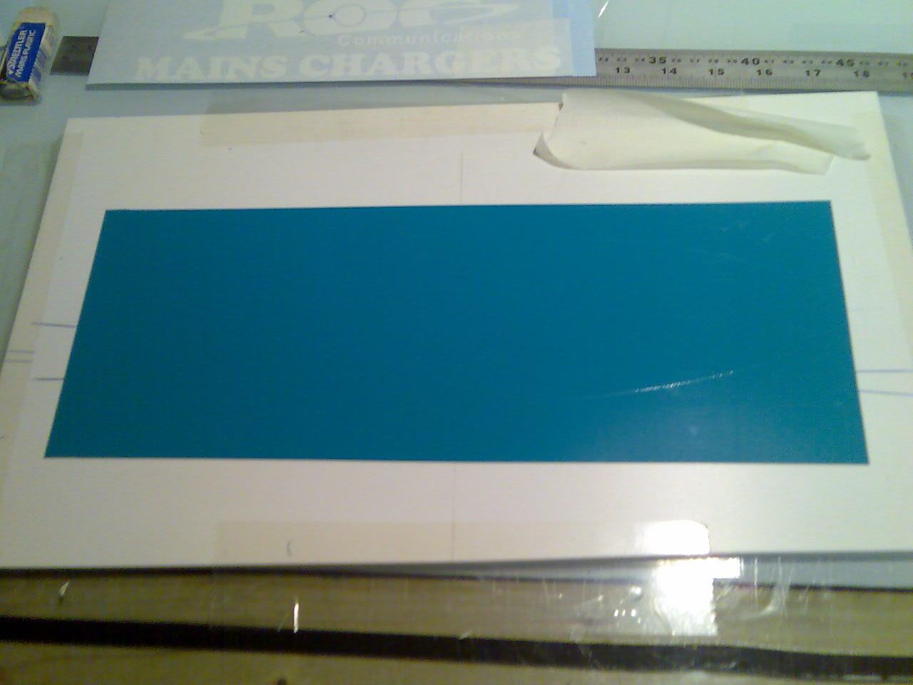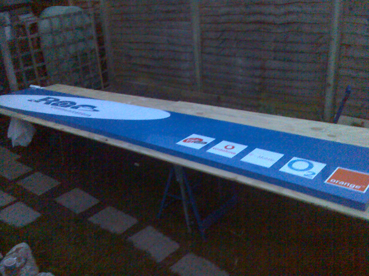 the main sign is flood-coated blue, which was a nightmare, the panel, despite my best efforts, was sagging slightly in the middle, causing air to be trapped at the edges, causing me to lose me rag a bit, and more than one atempt on the second half after i stuck me felt squeegee (new) thru the vinyl (why dont they put a rounded corner on them ?) !