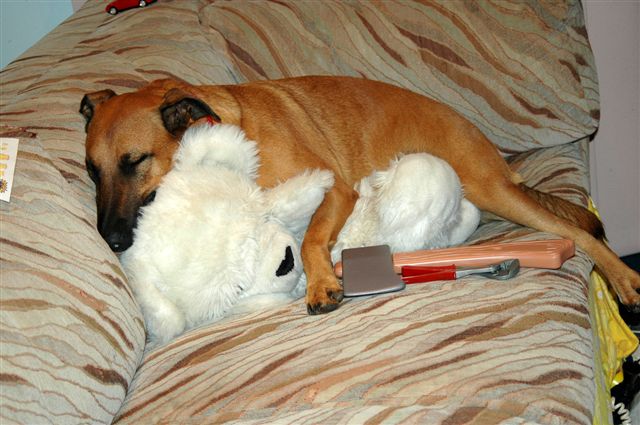 quote Shane Drew:Here is our dog, Missy, in a quiet moment, cuddling her teddy bear. A ridgeback x. Full of energy and frightfully protective…… 😮