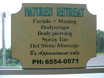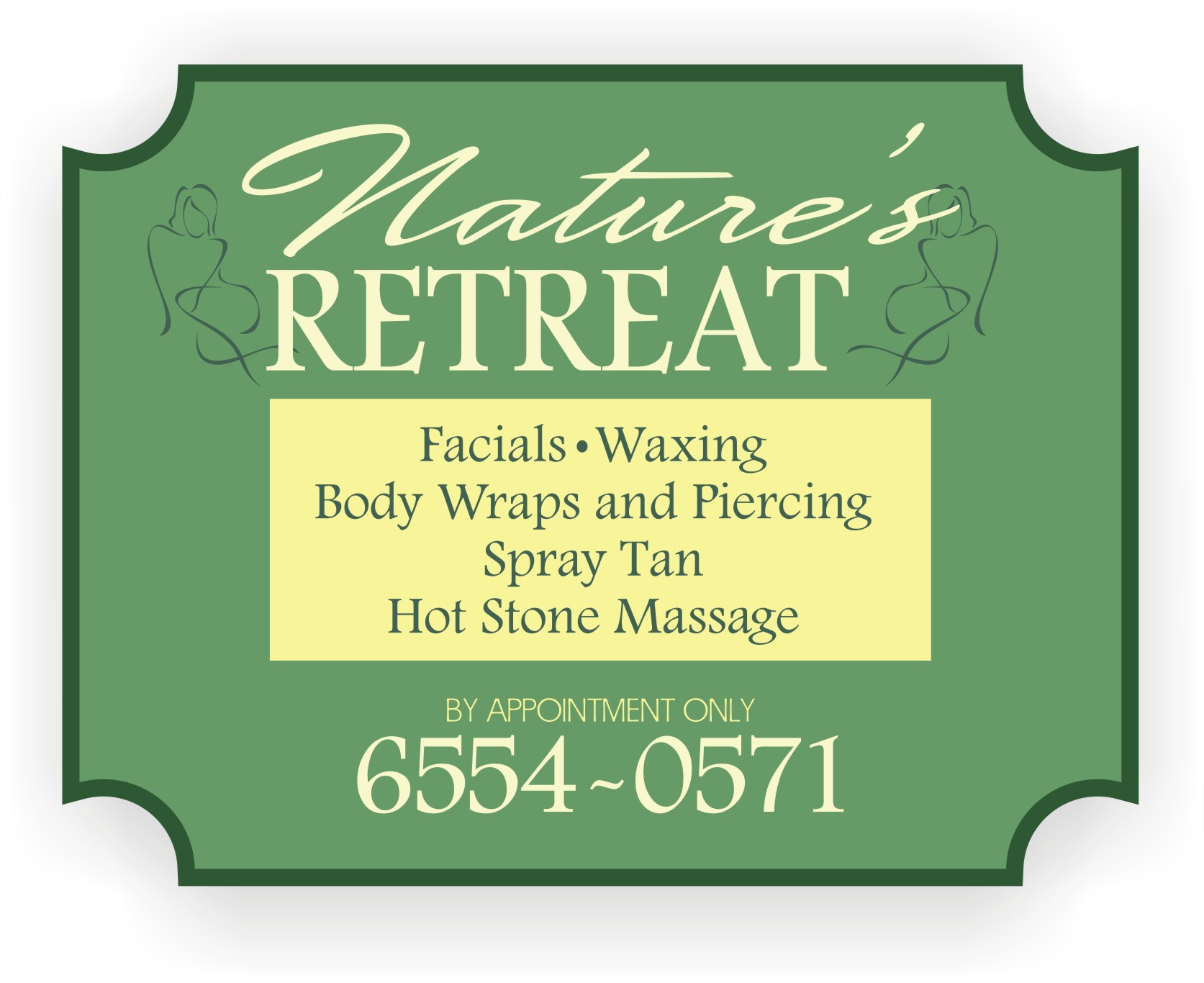 Shouldn’t it maybe be NATURE’S RETREAT? (Unless it’s plural nature). And the ‘tittle’ (dot over the ‘I’) is missing on the brush script, and By Appointment only (lower case ‘O’) looks a bit odd.
