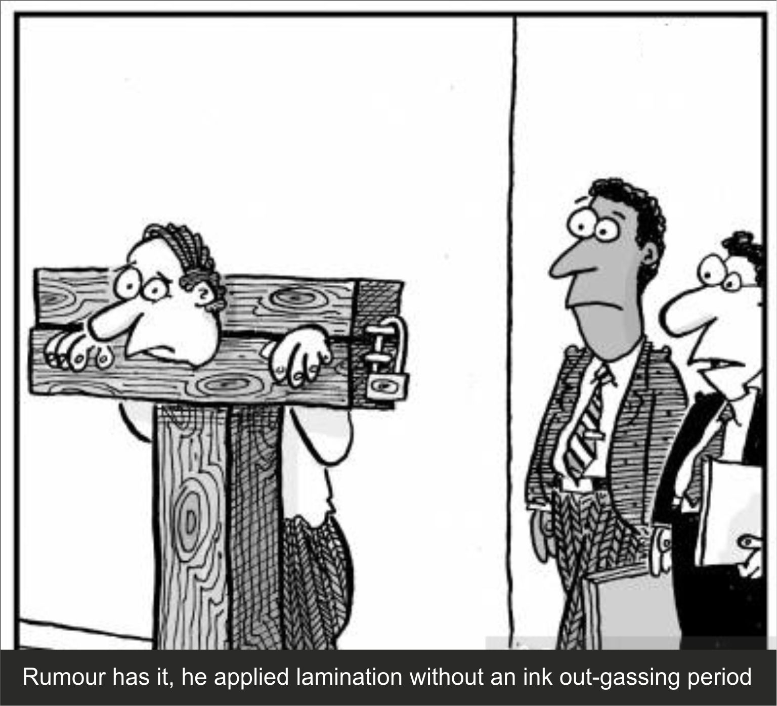 The vinyl has been printed onto, then laminated pretty much right away.The out gassing of the solvent ink MUST go somewhere, but it is now trapped between the laminate and the printed base layer of vinyl. This has an adverse effect on the laminates adhesive, making it gummy and never able to actually cure/bond to the layer of ink.
