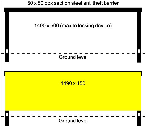 There is only 3 sections of steel to fix to, so the bottom section needs to be self supporting, also the position is near the sea and very windy. So that seems to rule out banners, plus a semi rowdy pub is just over the road and low banners would make nice playthings after closing time for the local thugs. Would painted 12mm ply do the job or can anybody come up with a better alternative? The barriers are removed to enable cars to be shifted around and are heavy enough as is is, so the added weight of the ply may be a bad point.