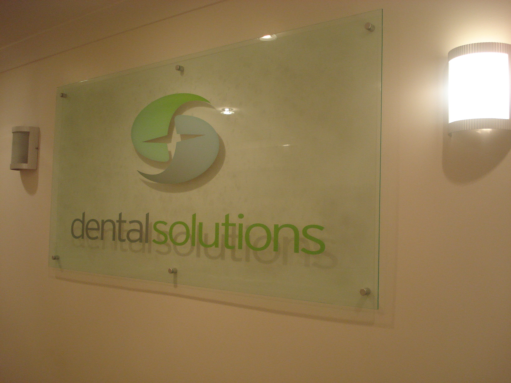 Dental solutions was green glass look acrylic with reverse mounted digital print – there is a shading on the logo which looks better in real life.