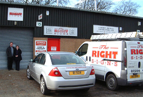 The Right Signs is run by husband and wife team Phill and Alison Fenton. The business operates from a small 1000 sq ft industrial unit based in Livingston West Lothian. The work done is mainly computer cut vinyl with a small amount of digital printing. Typical examples of the work produced include vehicle liveries, shop and factory signs, banners, "A" boards, window graphics and printed labels. The equipment used include a summagraphics summasign d610 and Roland PC600 printer/cutter. Sign design and cutting/printing is done using Casmate pro and Signlab 5 software.