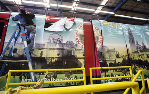 A tram decorated with scenes from Balboa Park will cruise the streets of San Diego to celebrate the centennial of the Panama-California Exposition. “One hundred years ago the trolley was a very important part of the fabric of our city,” noted San Diego City Councilman Todd Gloria, whose district includes the park, at a ceremony Wednesday to introduce the centennial tram. The 1995-vintage car is wrapped in a design by Metropolitan Transit System staff artist Julie Andrews. It shows scenes of the park and its museums and carries the slogan “Still Fabulous After 100 Years.”