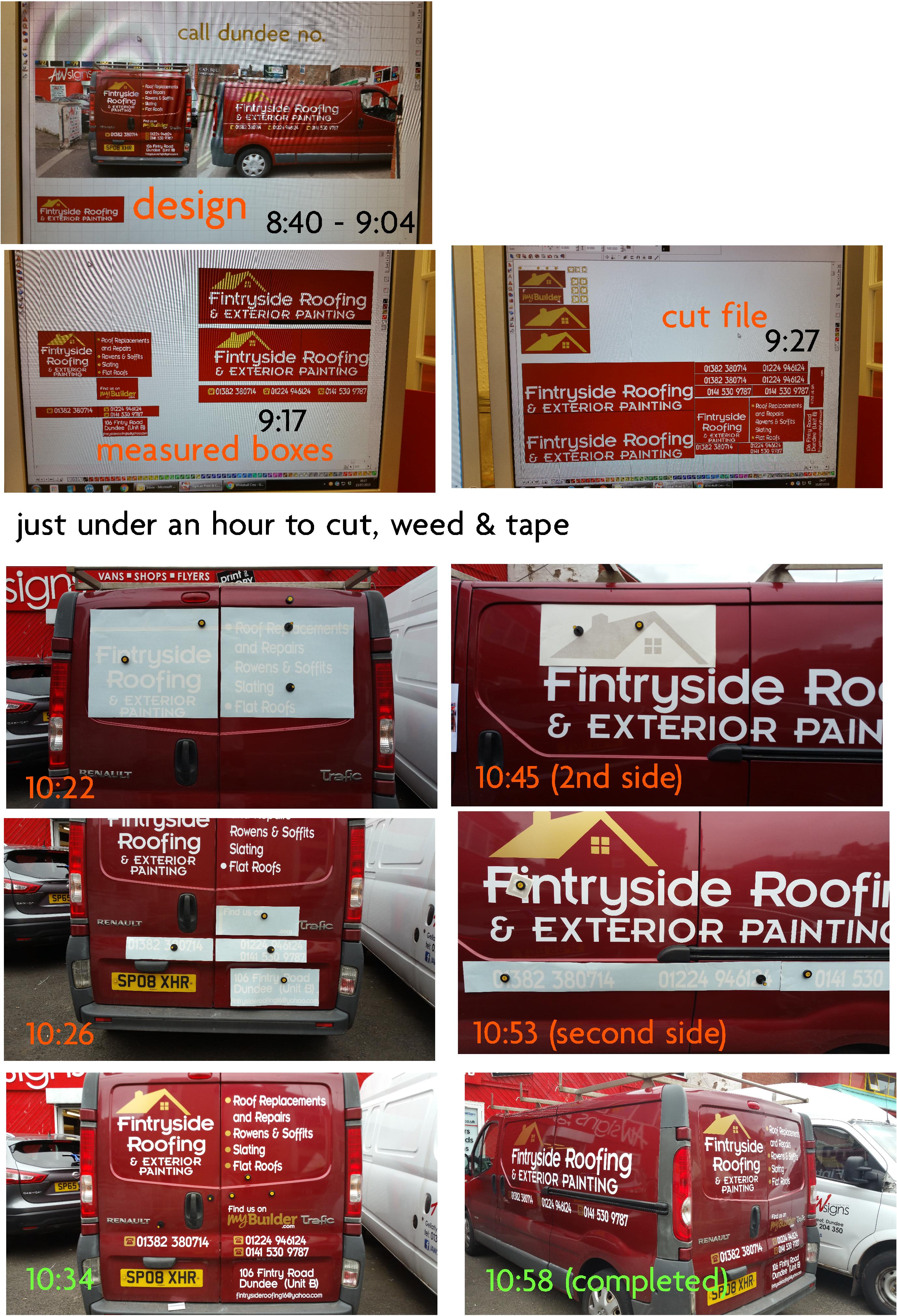 I’ll load up an example of what I do tomorrow. In the gallery for example the swift & green was a small van although van size doesn’t that much difference (unless it’s huge)…30 mins design plus 10 mins logo redraw, 15 mins for a cut file layout, 40 mins cut, weed, tape and cut out, max of 35-40 mins to fit it. I can be silly fast at weeding and trimming out is all ‘freehand’ at high speed (blade follows the outer edge on it’s own)…all edges / panels are thought out as part of the original design / cut file. Any inlays / overlays done by tagging one end and tensioning the vinyl over it to line up (doesn’t stick unless hot,), .. it’s all in the preparation and constantly looking to get more efficient…I even have 5 different sizes of squeegee…most common is a 2 foot wide for applying application tape…none of that rubbing a little 4" over it…thats for fitting vinyl only… and a handy spacing guide…right up to a 5 FOOT wide to apply prints to 10×5 panels (2 man job though).