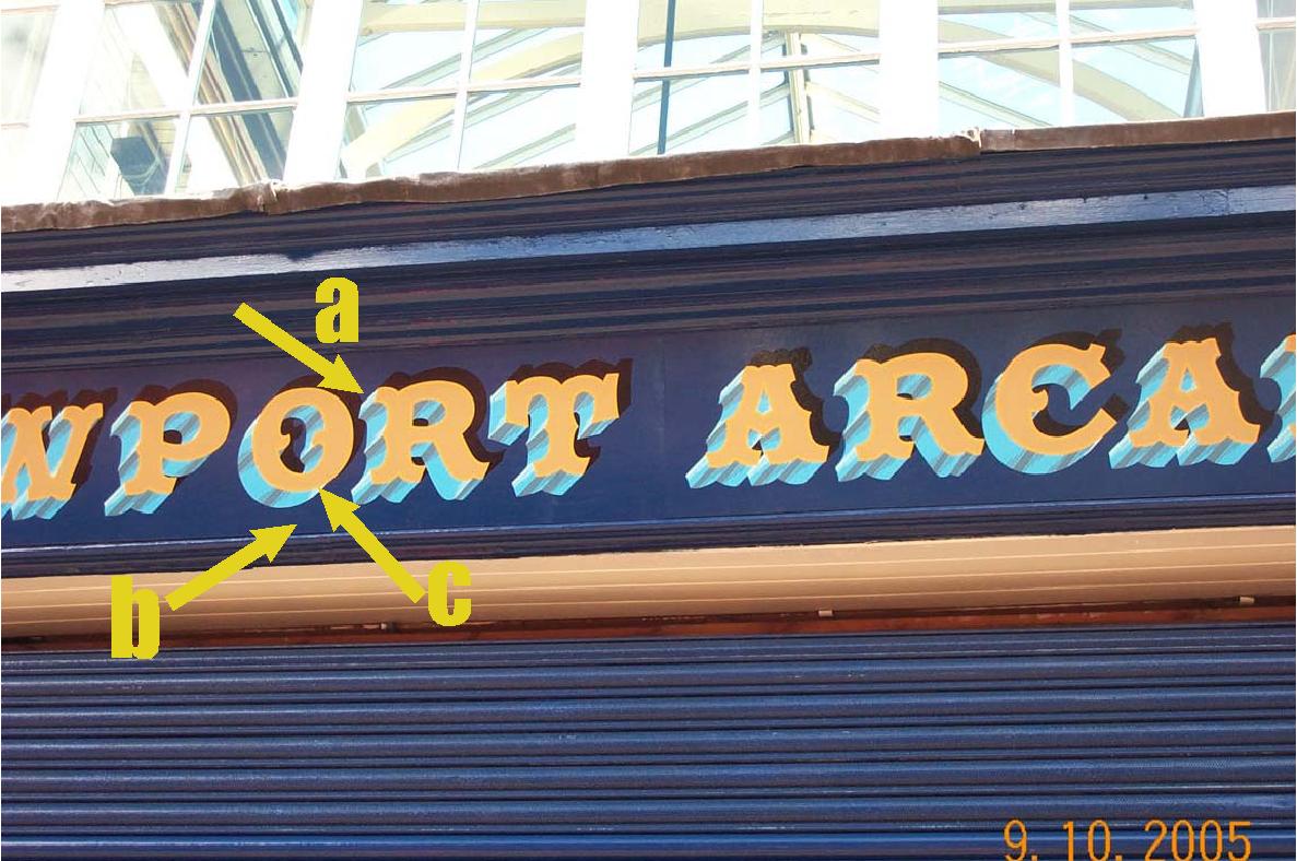 if the shadow is cast on top right the hitting light should generaly be lower left. this being the case the underside of these letters should not have the graduated dark spots where they are. they should be light leading into dark. my opinion anyway… 😉 :lol1:if an old signwriters at fairgrounds had shadows in wrong places then they too were wrong. it may have been their thing, but still would be deamed as wrong. we can argue the point out till we are blue in the face, its the artists style of the shadow is wrong.