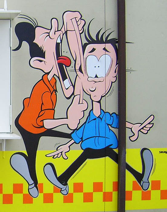 sketched out the cartoon to fit in the gap cut the vinyl away where the cartoon fell and painted the cartoon in one shot