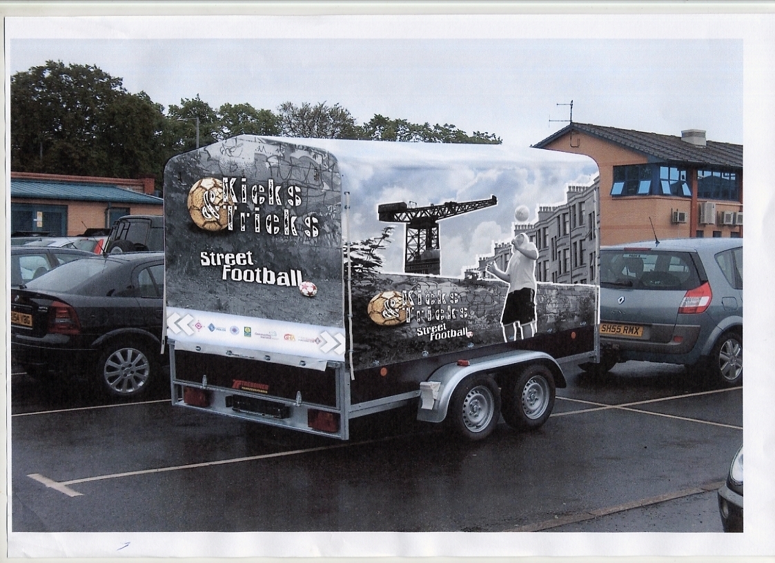 My client has bought a trailer with plain white PVC covers and wants an image applied to all sides.
