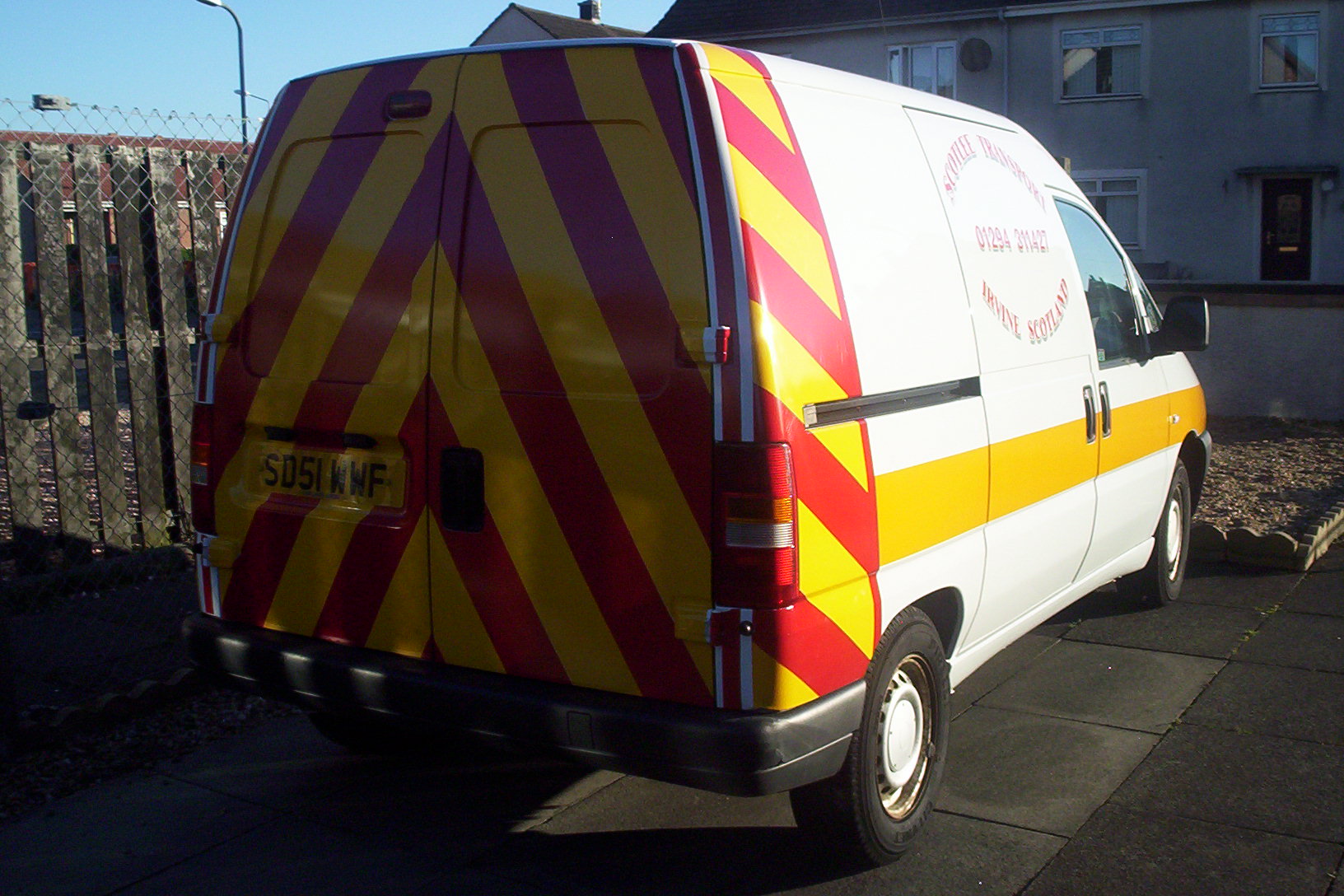 this job was murder, you only get one chance with reflective, i tend to do it wet, if the surface is flat, it will not conform, spent a few hours on the rear , i had to follow guidelines from the highways,with angles, and layout to their description, reguarding colours and position of text and sizes