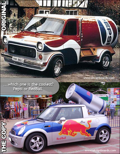 Home › Forums › Sign Making Discussions › Gallery › Vehicle branding – Pepsi or Redbull? Gallery Vehicle branding – Pepsi or Redbull? Posted by Robert Lambie on 15 September 2014 at 02:53 So which one do you think is cooler…. Traditional PEPSI or Modern REDBULL? Attachments: Cheryl Smith replied 11 years, 1 month ago 5 Members · 5 Replies 5 Replies John Thomson Member 15 September 2014 at 07:25 I saw the Pepsi van at the Scottish Motorshow a long , long time ago 😀 John Liam Pattison Member 15 September 2014 at 08:57 The Pepsi van wins easily for me! They should still have that going about now. Liam Unknown Member Member 15 September 2014 at 11:00 I read an article on the internet that Taurine found in red ball actually comes from the males juices of a ball…. Based on that I can’t even look at Red ball Many Thanks James Harry Cleary Member 15 September 2014 at 11:07 The ‘product’ is in my face more in the Red Bull one, so from a successful advert POV it has to be the Red Bull one. Cheryl Smith Member 15 September 2014 at 15:32 redbull Log In to Reply Log in to reply. Public All Members My Connections Only Me PublicAll MembersMy ConnectionsOnly Me Public All Members My Connections Only Me Log In to Reply Start of Discussion 0 of 0 replies June 2018 Now