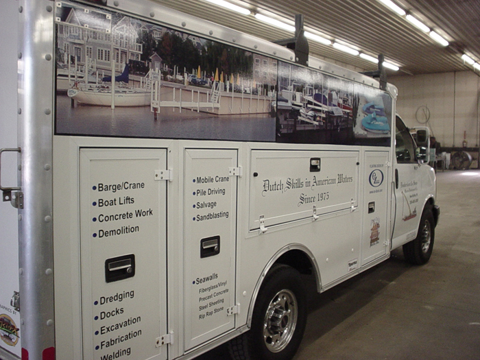 Posted by drogers4 on 10 September 2005 at 04:19Here are a couple of my first digital jobs I did when I got the versacamm a couple months ago. The truck is for a marine development co. wanting to show off some of their work with photos on their new trucks couldn’t seem to get a pic with no glare). The police car doesn’t need much explanation. Everything was applied dry, printed on oracal 3651 and laminated with oraguard 210. I will post more when I take some more pictures (hopefully a wrap on my own van soon).