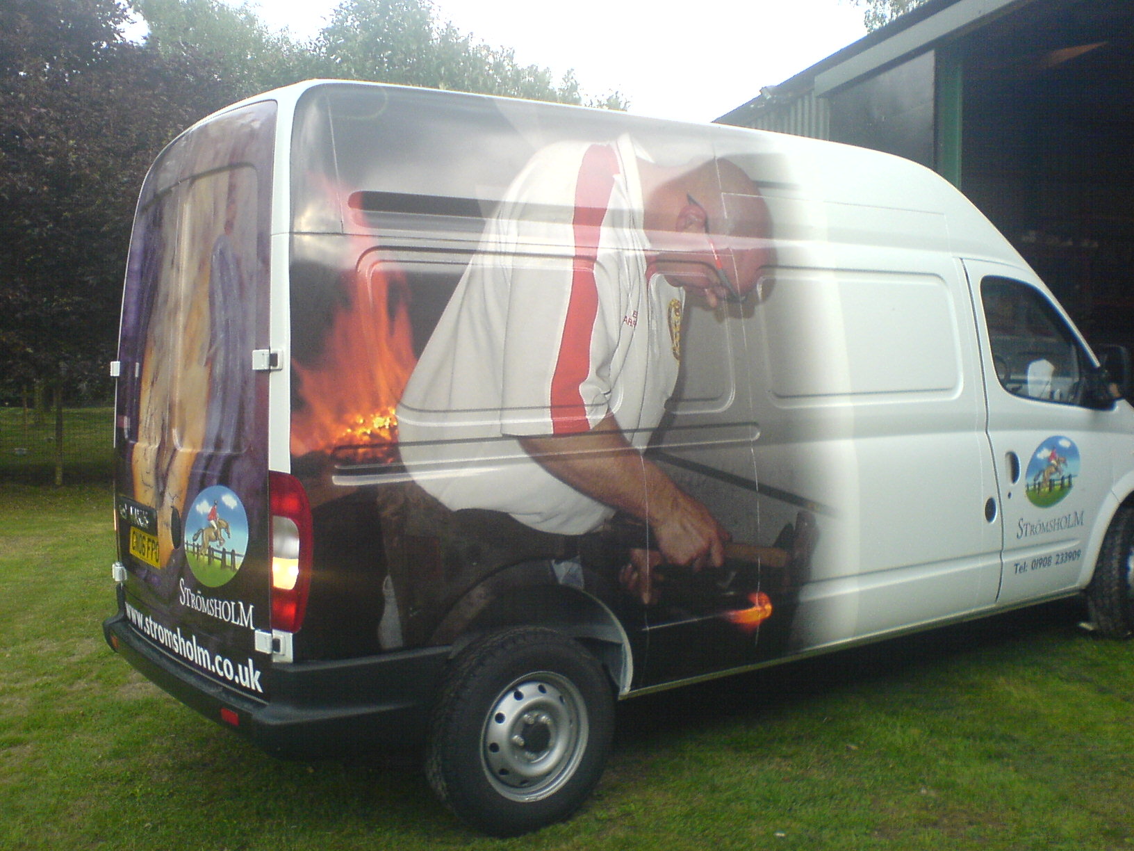 part wrap, back doors and sides, back pic shows a horse shoe "steaming" and the side pic shows a farrier making a shoe – all printed on our Mimaki JV3 onto Avery easy apply, with laminate